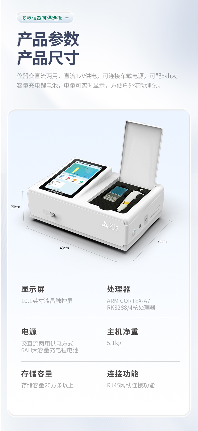3.一體化臺式快檢設備,采用交直流兩用供電方式,可連接車載電源,配備6ah大容量充電鋰電池,可以滿足現(xiàn)場及流動檢測使用的需求。儀器尺寸:43×35×20cm, 主機凈重:5.1kg