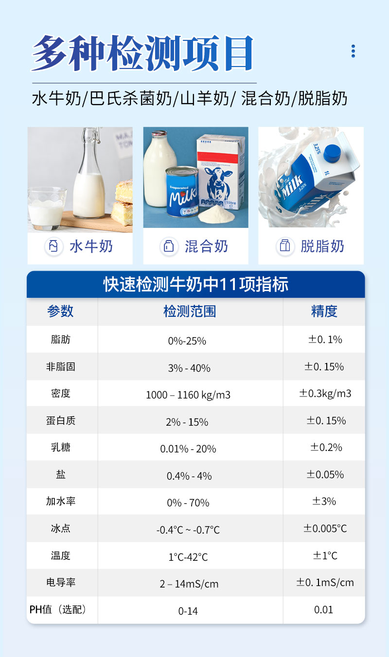 6、該分析儀還可以校準(zhǔn):水牛奶、 巴氏殺菌奶、 山羊奶、 混合奶、 脫脂奶、
