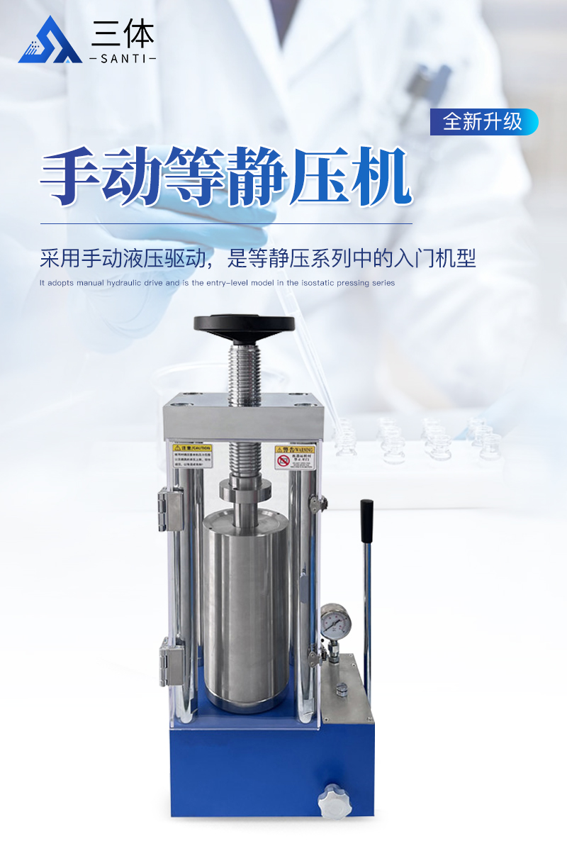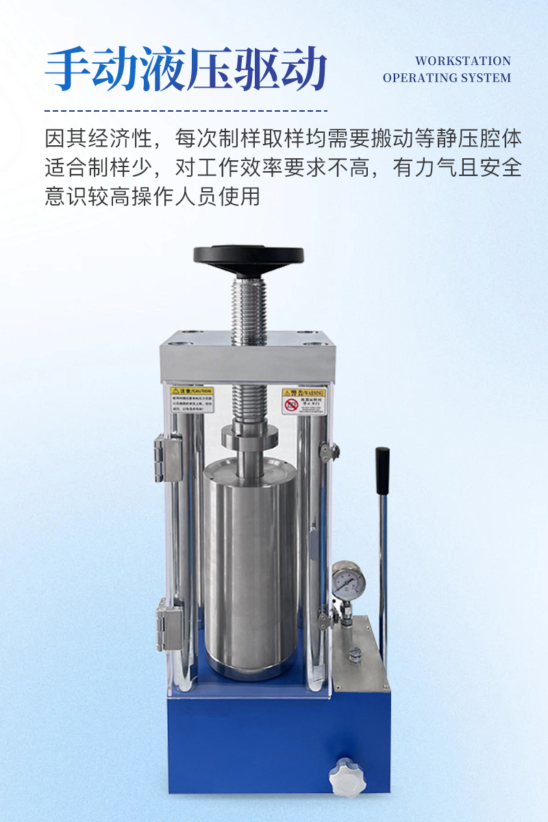 手動(dòng)等靜壓機(jī)該機(jī)采用手動(dòng)液壓驅(qū)動(dòng),是等靜壓系列中的入門機(jī)型,因其經(jīng)濟(jì)性,每次制樣取樣均需要搬動(dòng)等靜壓腔體,適合制樣少,對(duì)工作效率要求不高,有力氣且安全意識(shí)較高的男士操作使用。